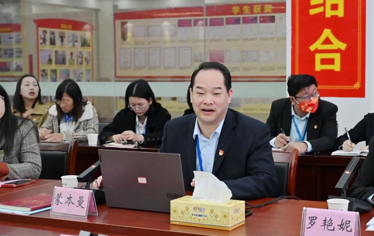 图为党委书记、督导专员蒙本曼汇报学校2024年开展思政理论课建设工作情况
