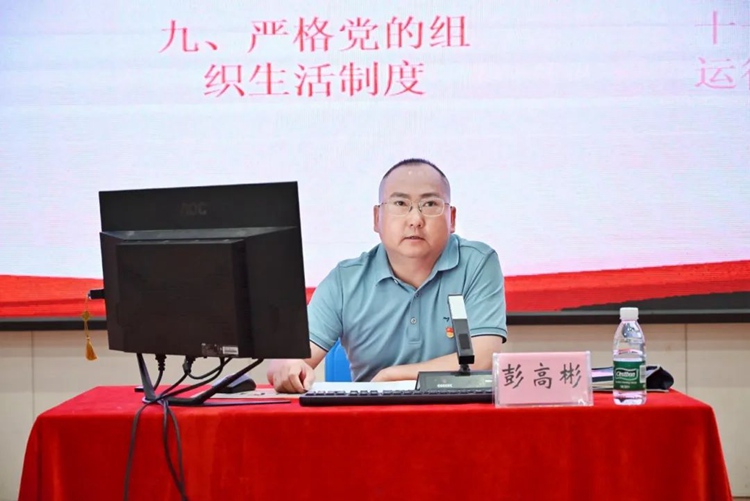 图为纪委书记、副校长彭高彬作题为《锤炼党性,廉洁自律》的专题培训