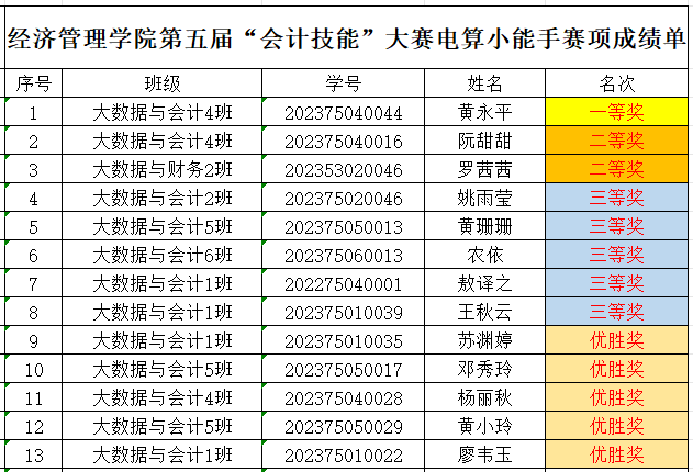 第五届会计技能大赛获奖名单