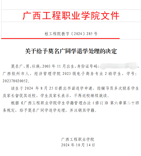 根据《普通高等学校学生管理规定》(教育部令第41号)、《开云网页版页面学生学籍管理办法(修订)》第二十四条规定,给予莫名广同学退学处理,并注销其学籍。