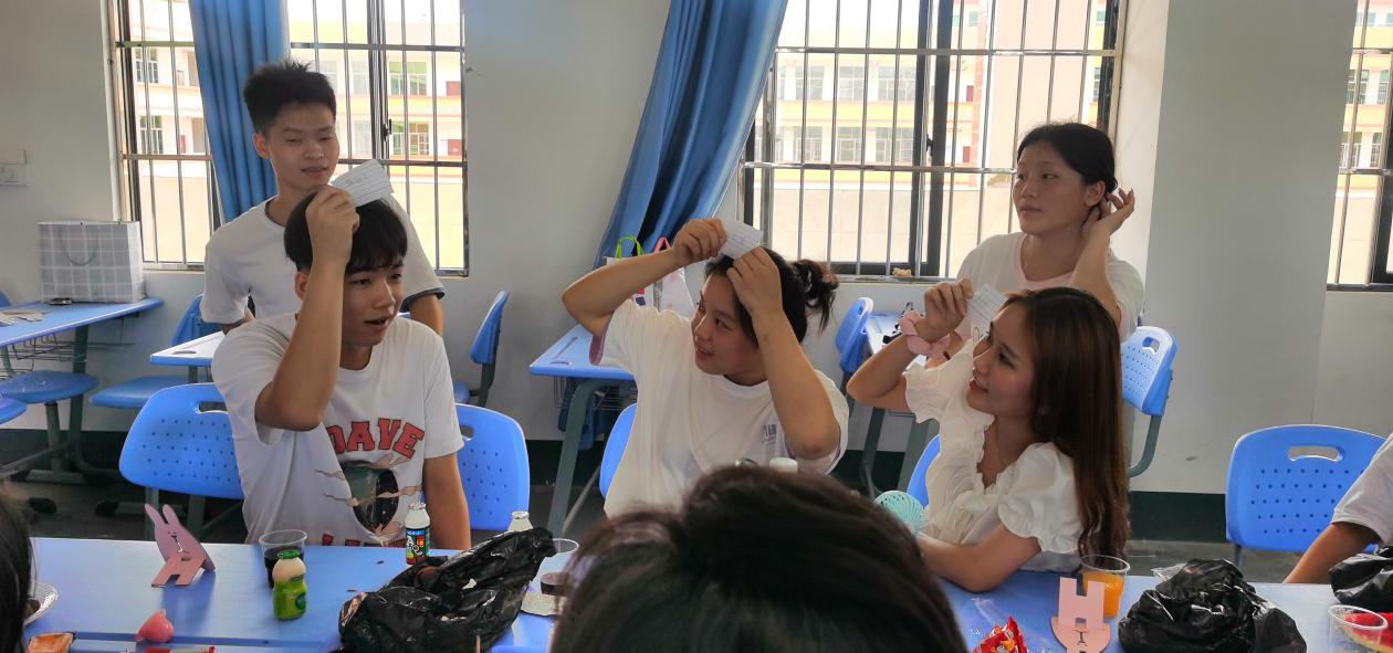 学生参加“害”你在心口难开游戏(在每个人的布带上都有一张精心准备好的卡片,卡片上写着被贴纸的人不能做的事或者不能说的话(也有陷阱卡),一旦被贴纸的人做出纸片上的事,就是中招了,要接受惩罚。)