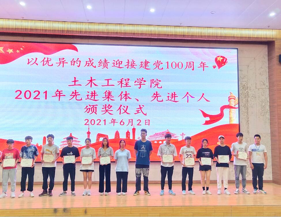 2021年6月2日,土木工程学院在图文信息大楼一楼学术报告厅举行2021年土木工程学院先进集体、先进个人颁奖仪式。出席颁奖仪式的有学校党委副书记、副校长胡细木、特邀嘉宾广西盛菲煌装饰工程公司李滋果经理、唐艳红女士、土木工程学院学生科科长陈春任、办公室主任黄连芳、土木工程学院第一党支部书记龙群良以及全体教师、部分班级的学生代表参加了会议。颁奖仪式由学校党委委员、土木工程学院党总支书记、副院长主持。颁奖会议在全体参会人员奏唱《国歌》中拉开序幕。