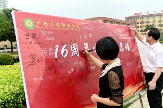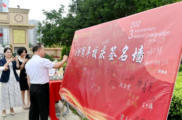 领导、嘉宾、校友及师生分别在学校16周年校庆签名墙上签名