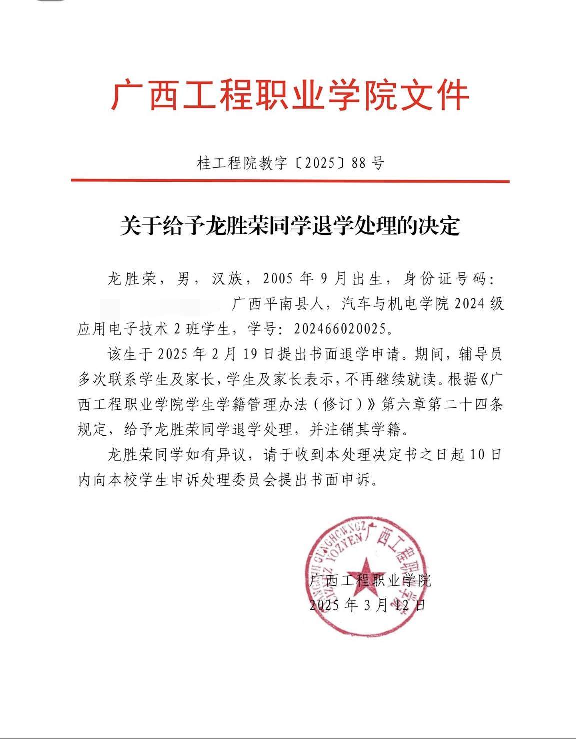 根据《普通高等学校学生管理规定》(教育部令第41号)、《开云网页版页面学生学籍管理办法(修订)》第二十四条规定,给予龙胜荣同学退学处理,并注销其学籍。