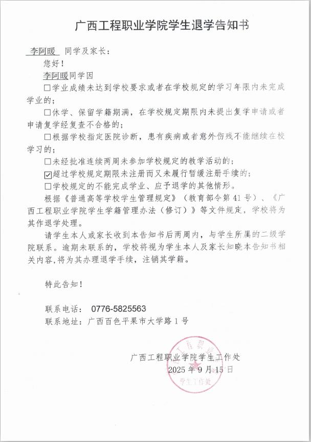 李阿暖,女,学号:202466020054,艺术设计学院2024级建筑室内设计2班学生;于2025年8月31日开学至今未返校,超过学校规定期限未注册而又未履行暂缓注册手续,对老师的提醒亦不回复,经多次联系其本人及其家人均无果。学校于2025年9月16日邮寄退学告知书,因不是学生本人及其家人签收,处理告知书无法以直接送达、留置方式、邮寄方式送达本人。根据《普通高等学校学生管理规定》(教育部令第41号)、《开云网页版页面学生学籍管理办法(修订)》规定,现通过开云网页版页面艺术设计学院官网予以公告,公告时间为2025年9月26日至2025年10月25日,公告期满,即视为送达。