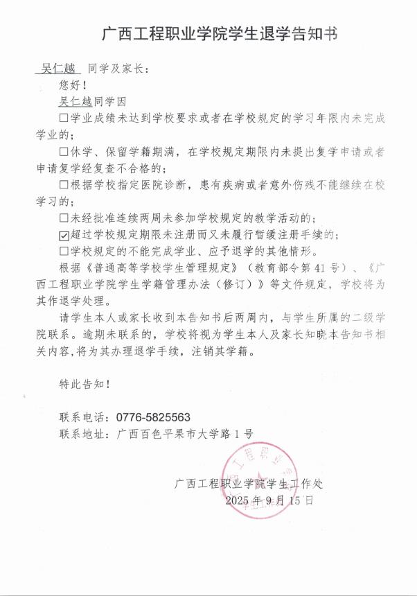吴仁越,男,学号:202447020041,艺术设计学院2024级广告艺术设计2班学生;于2025年8月31日开学至今未返校,超过学校规定期限未注册而又未履行暂缓注册手续,对老师的提醒亦不回复,经多次联系其本人及其家人均无果。学校于2025年9月16日邮寄退学告知书,因不是学生本人及其家人签收,处理告知书无法以直接送达、留置方式、邮寄方式送达本人。根据《普通高等学校学生管理规定》(教育部令第41号)、《开云网页版页面学生学籍管理办法(修订)》规定,现通过开云网页版页面艺术设计学院官网予以公告,公告时间为2025年9月26日至2025年10月25日,公告期满,即视为送达。