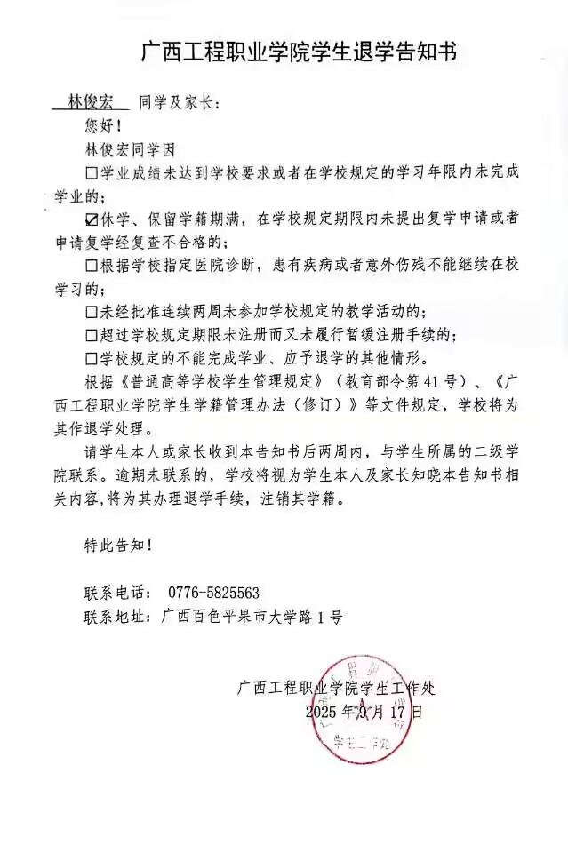 林俊宏,男,学号202366030037,艺术设计学院2023级建筑室内设计3班;因想出去工作实践一年,于2024年9月1日-2025年9月1日办理休学,休学期为1年,2025年9月2日休学期满,在学校规定的期限内未提出复学申请,对老师的提醒亦不回复,经多次联系其本人及其家人均无果。因无法联系本人及其家人,处理告知书无法以直接送达、留置方式、邮寄方式送达本人。根据《普通高等学校学生管理规定》(教育部令第41号)、《开云网页版页面学生学籍管理办法(修订)》规定,现通过开云网页版页面艺术设计学院官网予以公告,公告时间为2025年10月11日至2025年11月9日,公告期满,即视为送达。