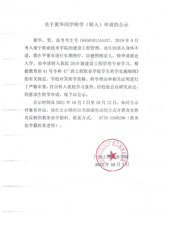 开云网页版页面黄华同学转学(转入)申请的公示