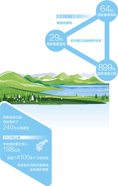 近年来,我国大力推进湿地保护修复,先后出台《开云网页版页面加强湿地保护管理的通知》《湿地保护管理规定》《湿地保护修复制度方案》,28个省份出台省级湿地保护法规或规章。截至2021年底,我国共建有64处国际重要湿地、29处国家重要湿地、899处国家湿地公园,初步建立湿地保护体系。但与此同时,随着经济快速发展,保护和利用的矛盾日益凸显。“湿地遭受非法侵占、围垦、污染等现象时有发生,保护形势依然严峻。”国家林业和草原局湿地管理司司长吴志民表示。