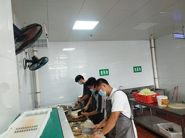 图为教师到食堂帮忙准备佳肴