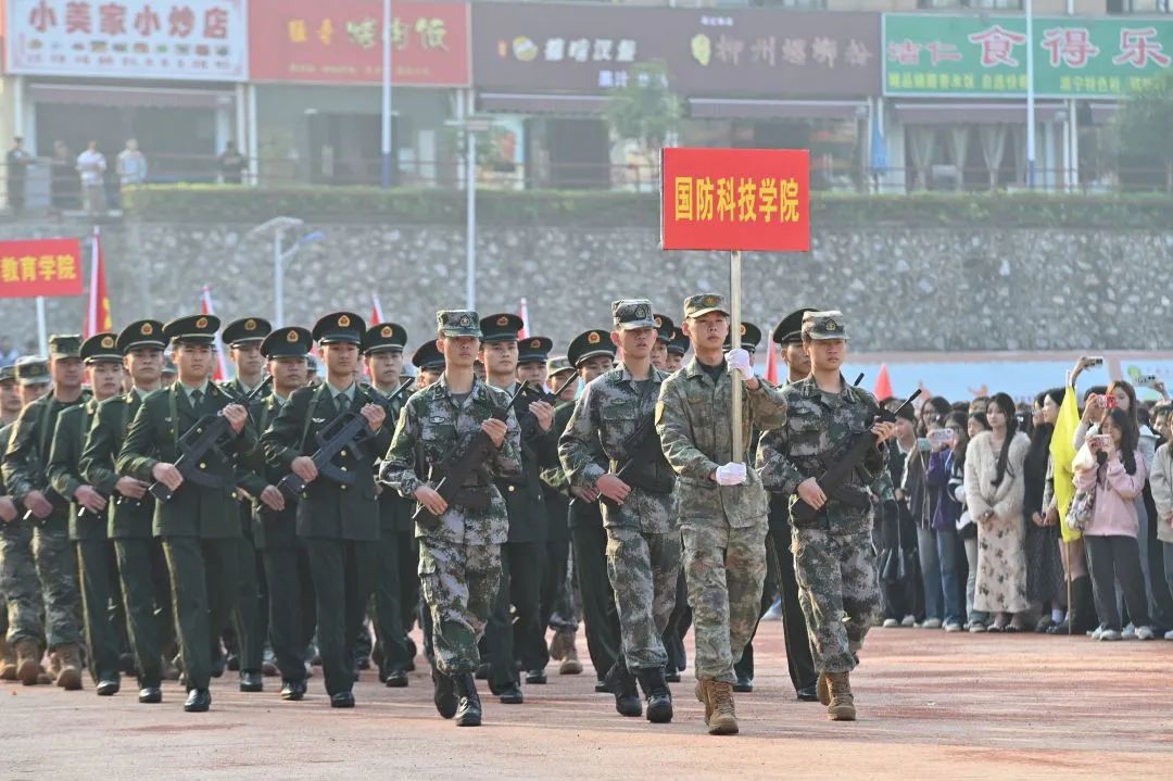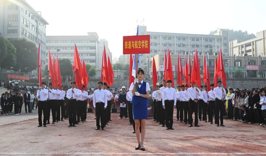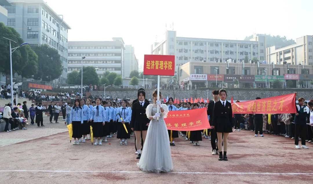 国旗队、会徽队、鲜花队、彩旗队、裁判员、教师代表队、二级学院各方阵出列,他们穿着整齐服装,高举方阵旗帜,喊着响亮口号,在慷慨激昂的乐声中昂首挺胸。坚定的步履踏在运动场上,传递着积极向上、团结拼搏的体育精神。