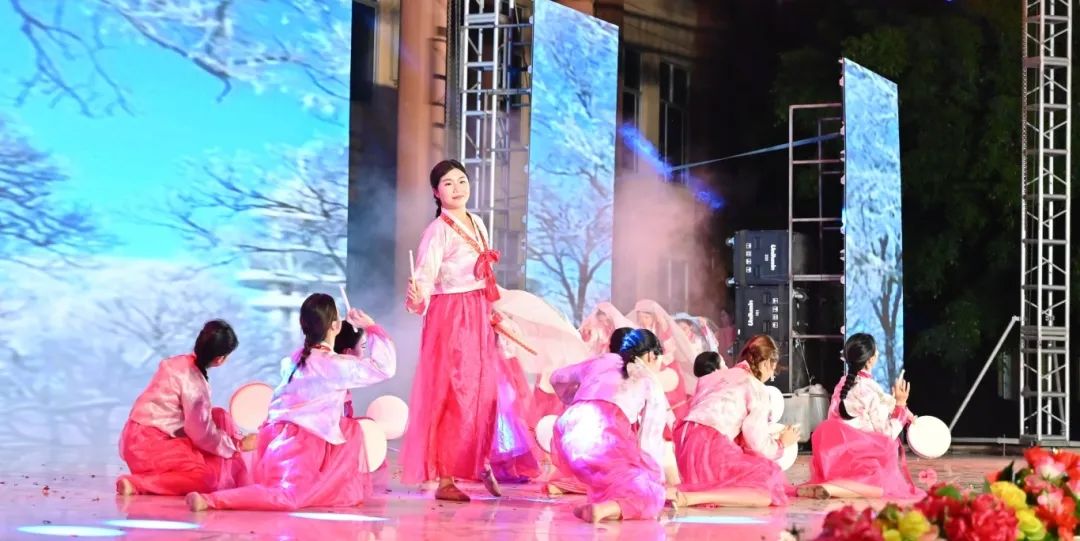 舞者们以婀娜身姿,勾勒出民族风情与校园精神交织的美妙画卷。她们宛如春日里破土而出的新芽,带着清新与灵动,在舞台上缓缓舒展。每一个动作都轻盈飘逸,仿佛是被春风轻拂过的柳枝,柔美而富有韵律