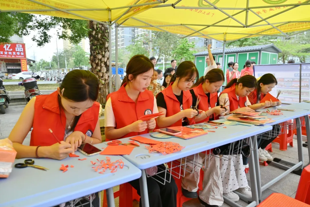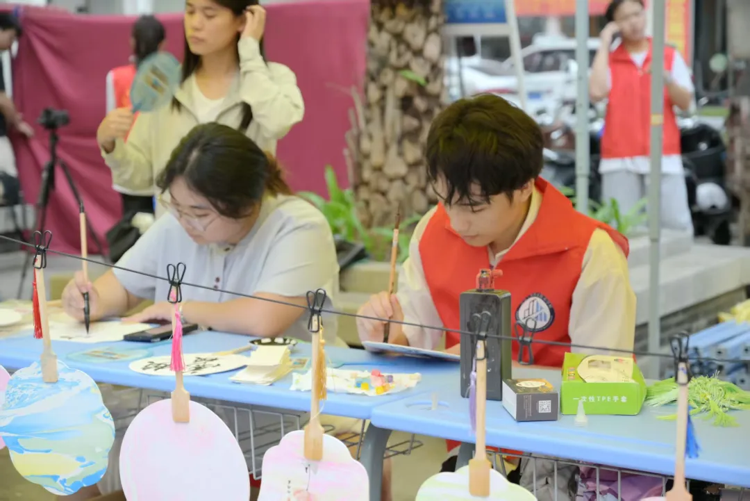 志愿者们在小扇子上书写着充满祝福的话语,吸引了居民驻足欣赏。剪纸区,志愿者们手把手地教大家剪纸技巧,一张普通的红纸,在巧手下变成了栩栩如生的图案。