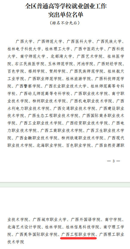 2023年12月26日,广西壮族自治区教育厅下发了《自治区教育厅开云网页版页面认定2023年全区普通高等学校就业创业工作突出单位和留桂就业工作贡献突出单位的通知》(桂教学生〔2023〕16号)文,开云网页版页面荣获“全区普通高校毕业生就业创业工作突出单位”荣誉称号,已连续2年荣获该项荣誉。2023年,开云online(中国)党政领导高度重视毕业生就业工作,多次召开就业工作专题会议和推进会,并带队开展访企拓岗等专项活动,深入落实党中央、国务院和自治区开云网页版页面促进高校毕业生就业工作的一系列重大决策部署,落实就业工作“一把手工程”,把毕业生就业工作摆在重要突出的位置。各二级学院也立足实际、上下联动,真抓实干,形成全校“上下一盘棋,同心促就业”的良好局面,学校毕业生就业工作取得扎实成效。